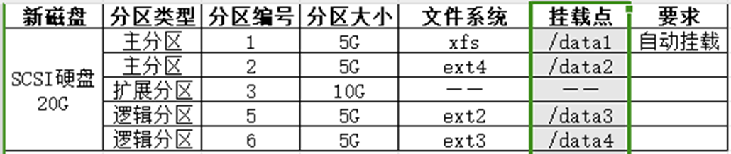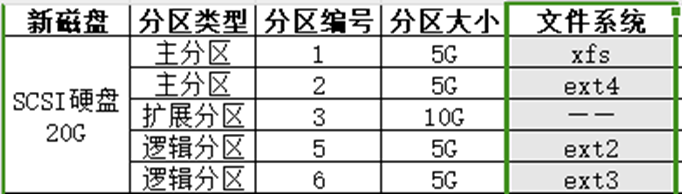 (4)按下表要求在设备/dev/sdb的分区上创建文件系统: